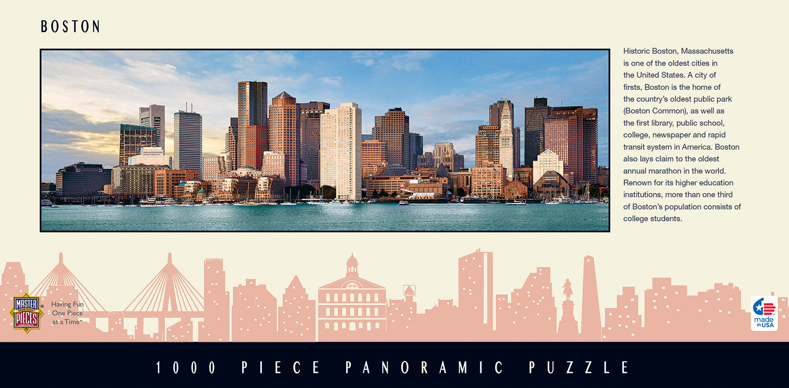 This MasterPieces 1000pc 13" x 39" Boston Panoramic Puzzle is a great way to learn more about America, and have fun in the process! This aerial panoramic photograph of Boston was taken by Jon Holiday. It features a breathtaking view of Boston at a glance from the Boston Harbor.