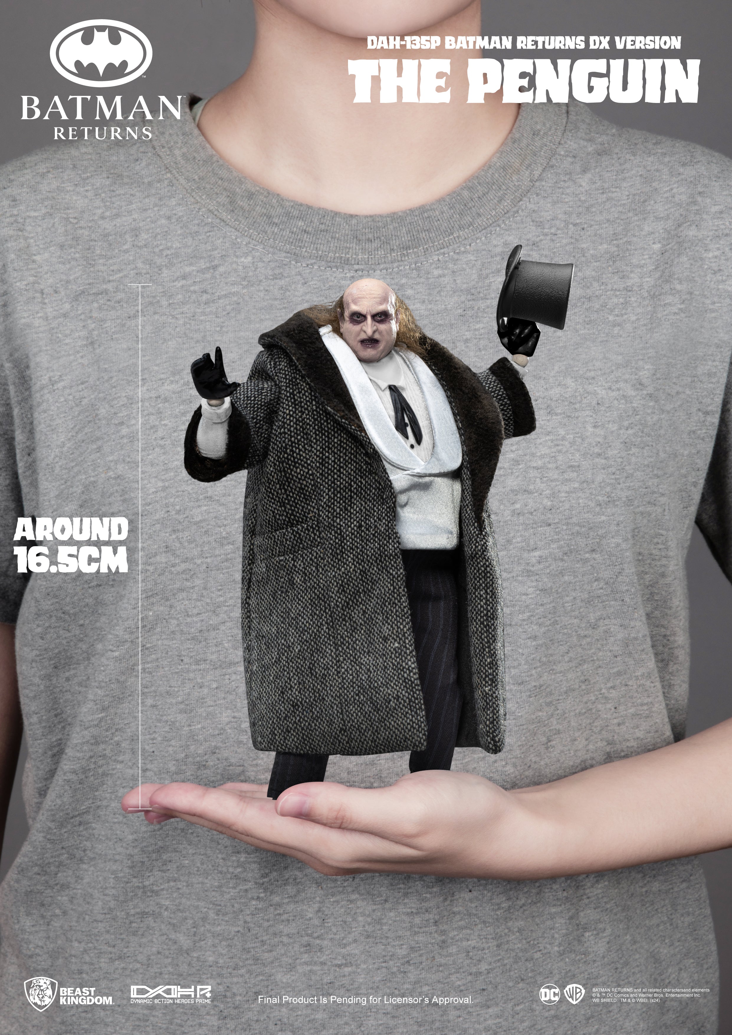 To honor this character, Beast Kingdom proudly presents the latest addition to its DAH series, DAH-134P Batman Returns The Penguin. This figure faithfully captures the Penguin’s dark look from the film. The head sculpt highlights the facial details, rooted hair creates his messy locks, and the skin texture reflects his unique expression. The body replicates his rounded physique and signature gray suit. The coat, made of quality fabric, includes brown velvet-like accents on the collar and cuffs, with interior details like lining and pockets. This figure has 18 points of articulation and includes interchangeable hands, along with the signature umbrella, mini weaponized penguin, bucket, fish, and an extra set of hands. Limited to 3,000 sets worldwide, with a collector's certificate., this is a must-have for Penguin fans.