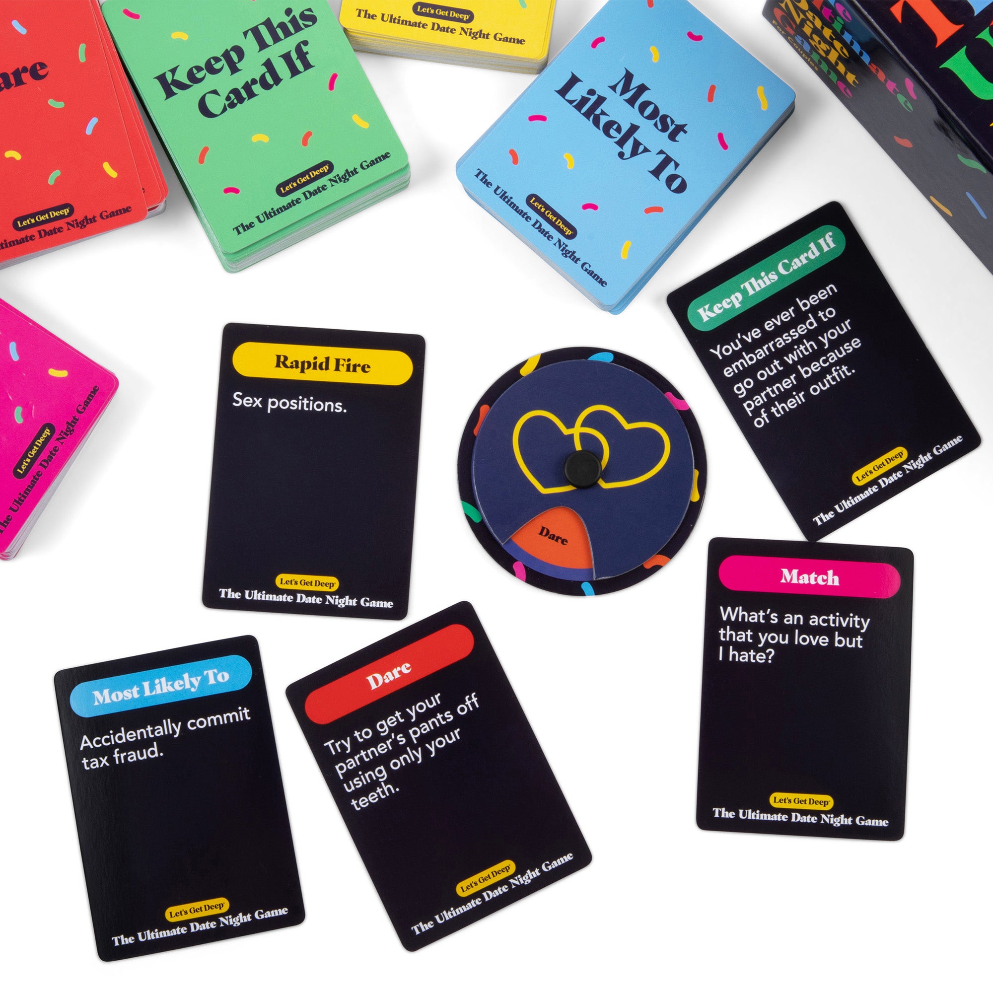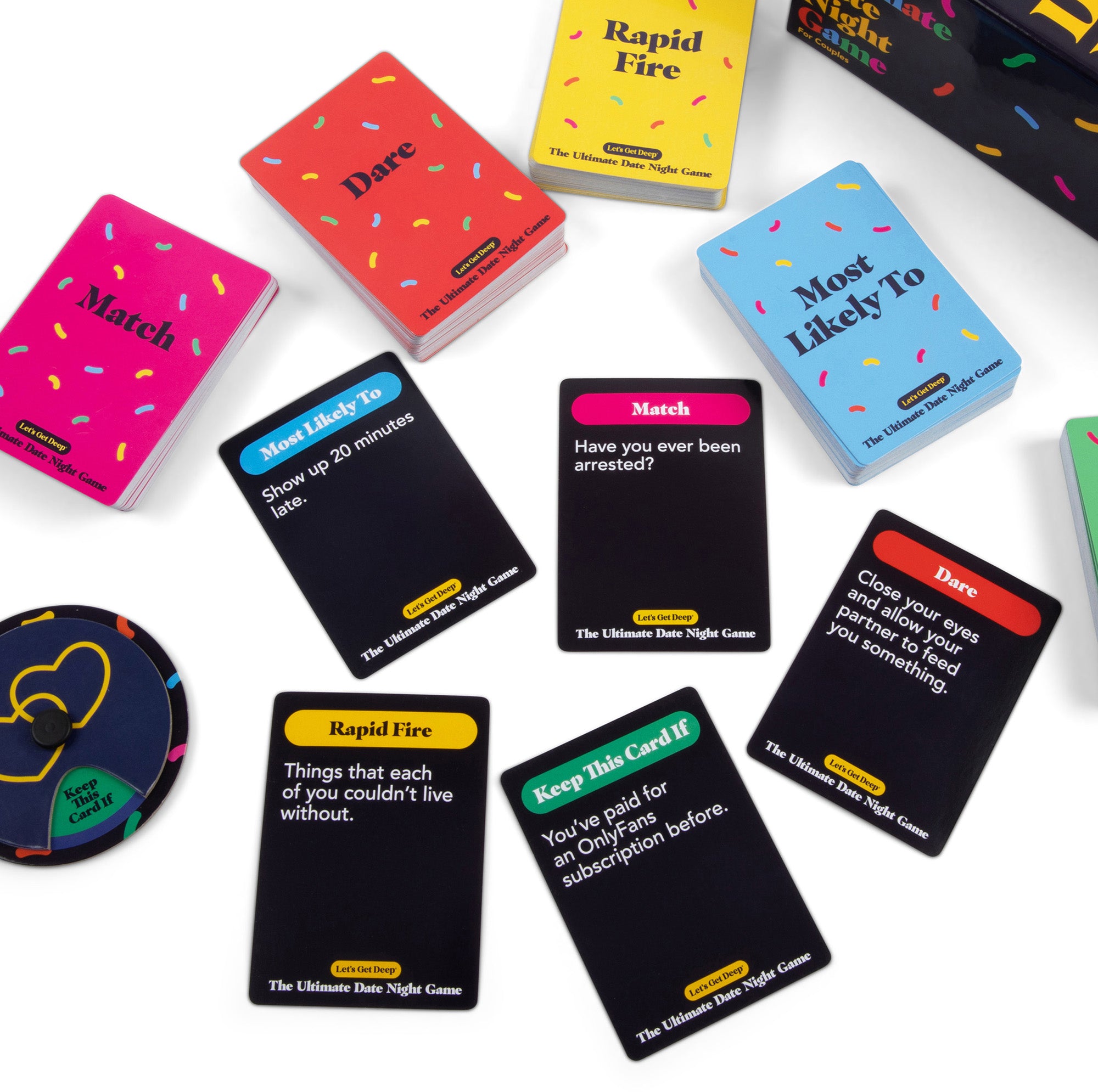 - This date night game includes 5 categories of mini-games; Most Likely To, Rapid Fire, Match, Dare, and Keep This Card If.