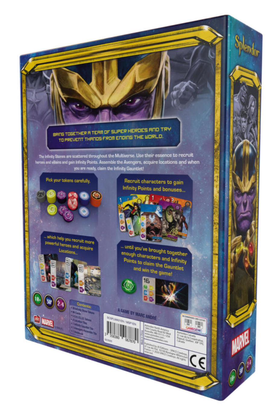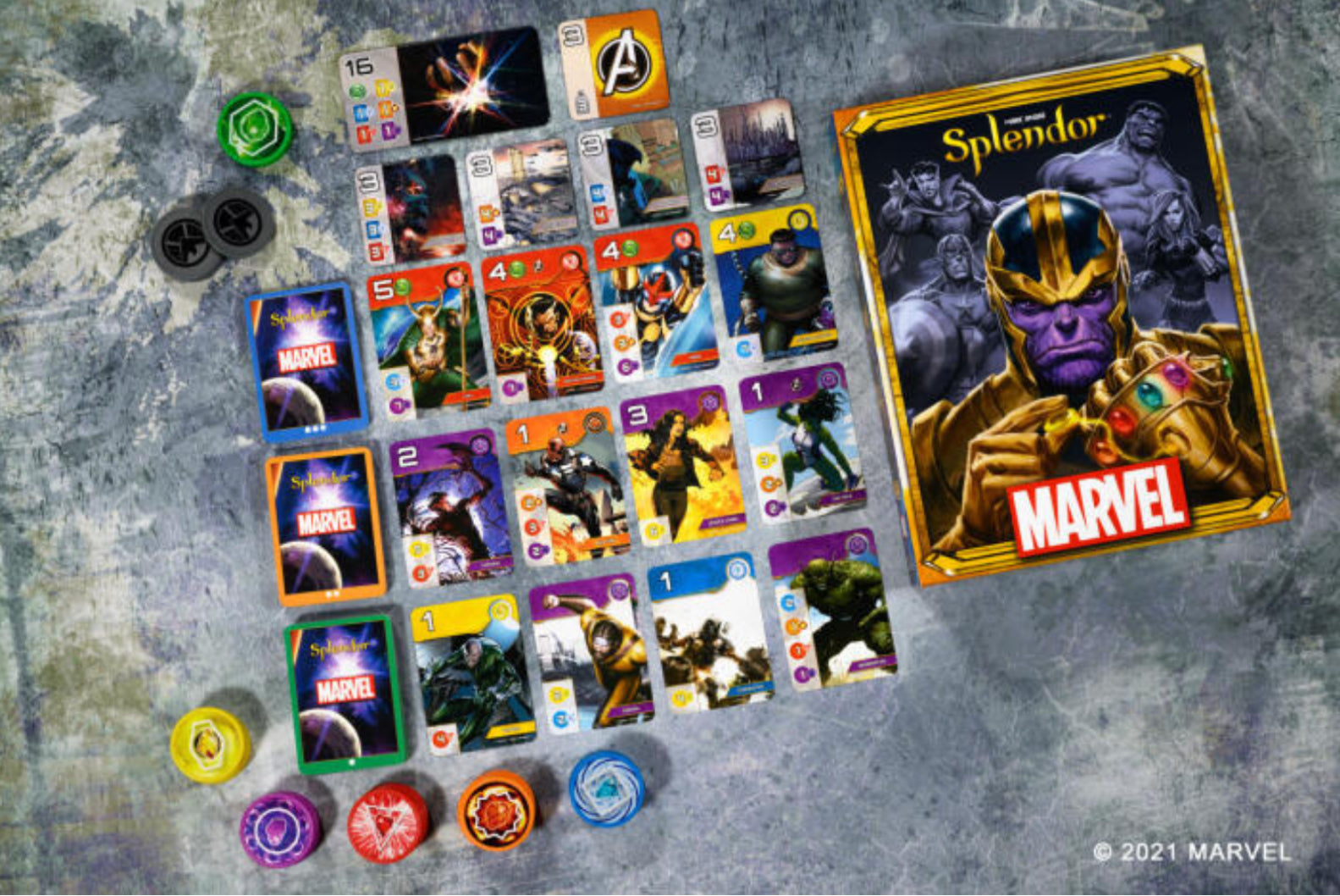 Marvel Splendor board game box with Thanos and other characters on a dark background