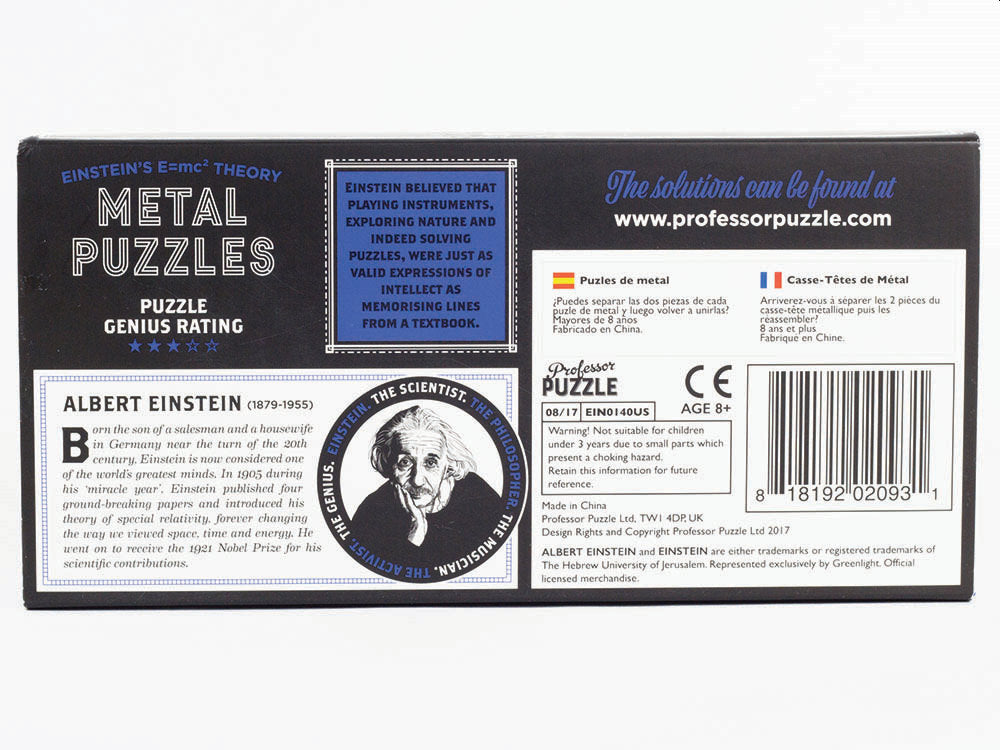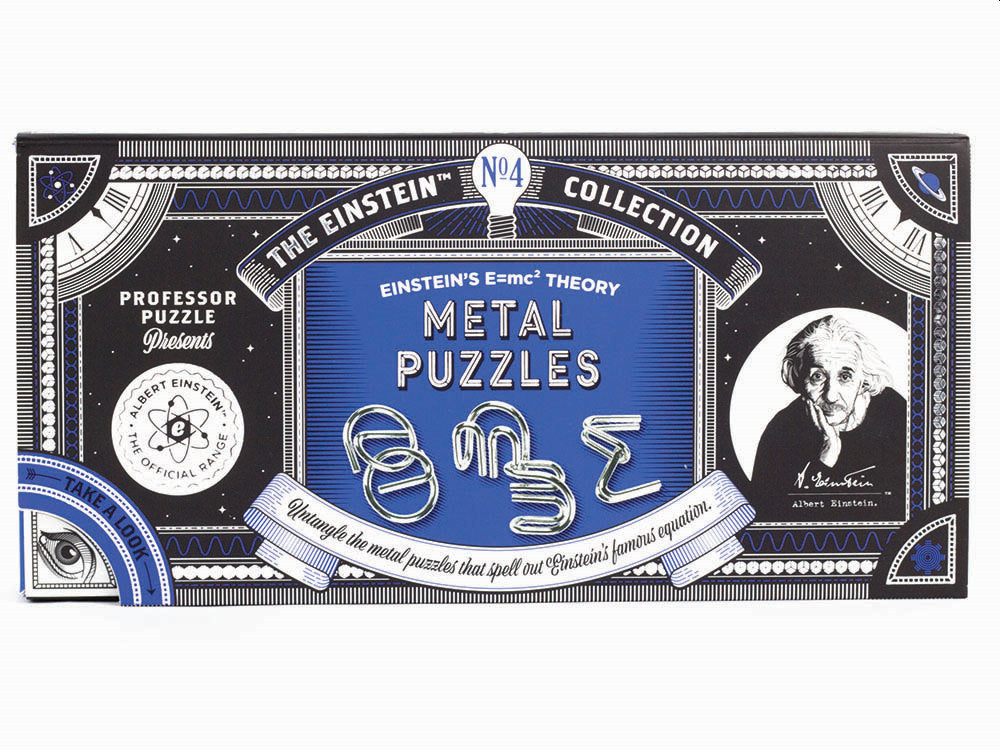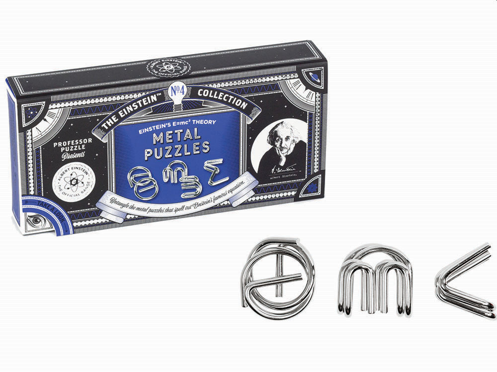 Formed of the symbols of Einsteins ground-breaking E=mc2 equation, see if you can separate the two pieces of each metal puzzle and then reattach them.
