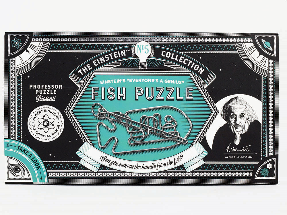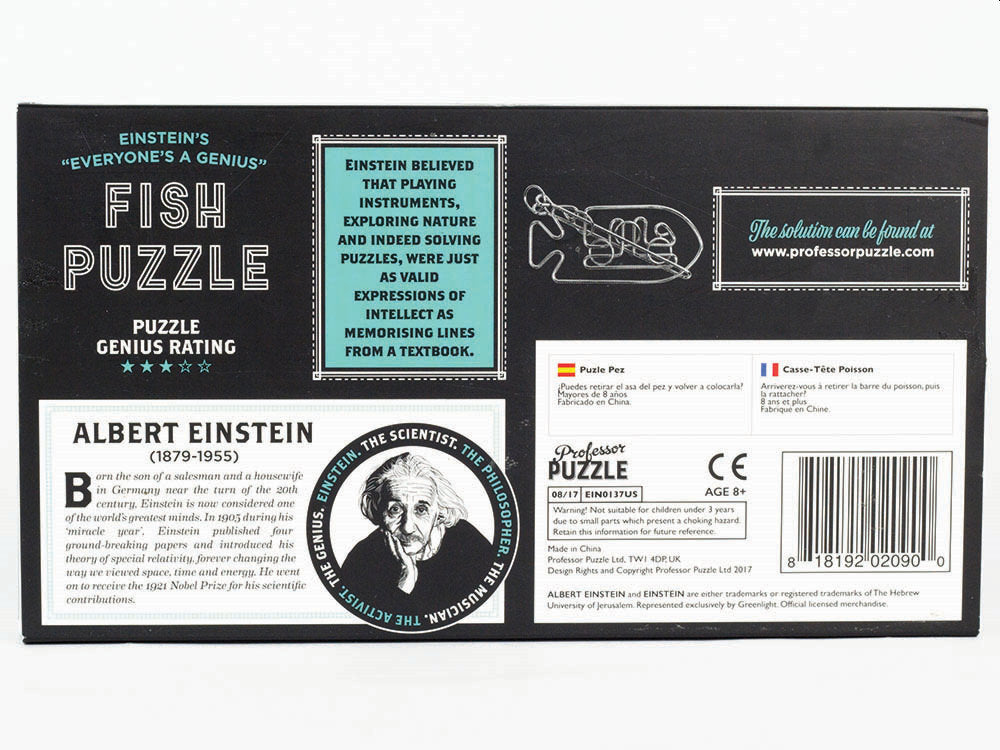 Einstein-themed fish puzzle packaging with a metal fish puzzle piece on a white background