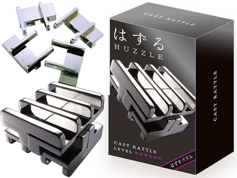 Rattle puzzle has four of the same shape pieces that are loosely interlocked. Because the pieces fit loosely it would seem that it would be easy to take apart. This is an interlocking style puzzle where pieces need to be moved slightly, shifted left or right, then another piece moved slightly and shifted in a series of numerous moves.