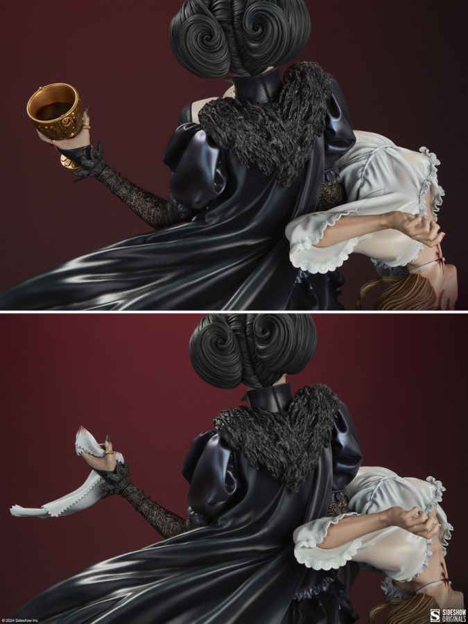 No throat is safe from her inhuman hunger! The wicked vampiress tightly clutches her victim's supple thigh as they levitate in a mid-meal swoon of blood, bats, and unearthly beauty. In her other hand, the she-vamp sips sanguine sustenance from a golden goblet - after all, it's just her type. A swap-out arm included with the piece holds a bloody handkerchief instead, because no matter how messy her feast gets, good manners never die.