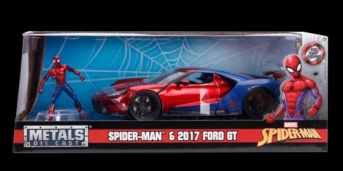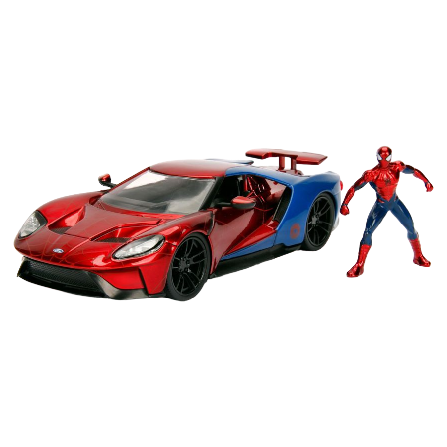 With styling cues inspired by the friendly neighborhood web-slinger, Spider-Man, this 2017 Ford GT features an opening hood, doors, and an adjustable rear spoiler. This vehicle also includes a 2.75" Spider-Man die-cast collectible figure and is sure to be a standout in any vehicle collection!