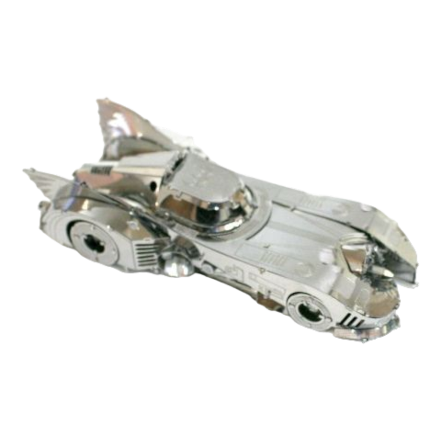 Metallic shark-shaped object on a white background. Batman (1989) Batmobile Metal Model Kit.