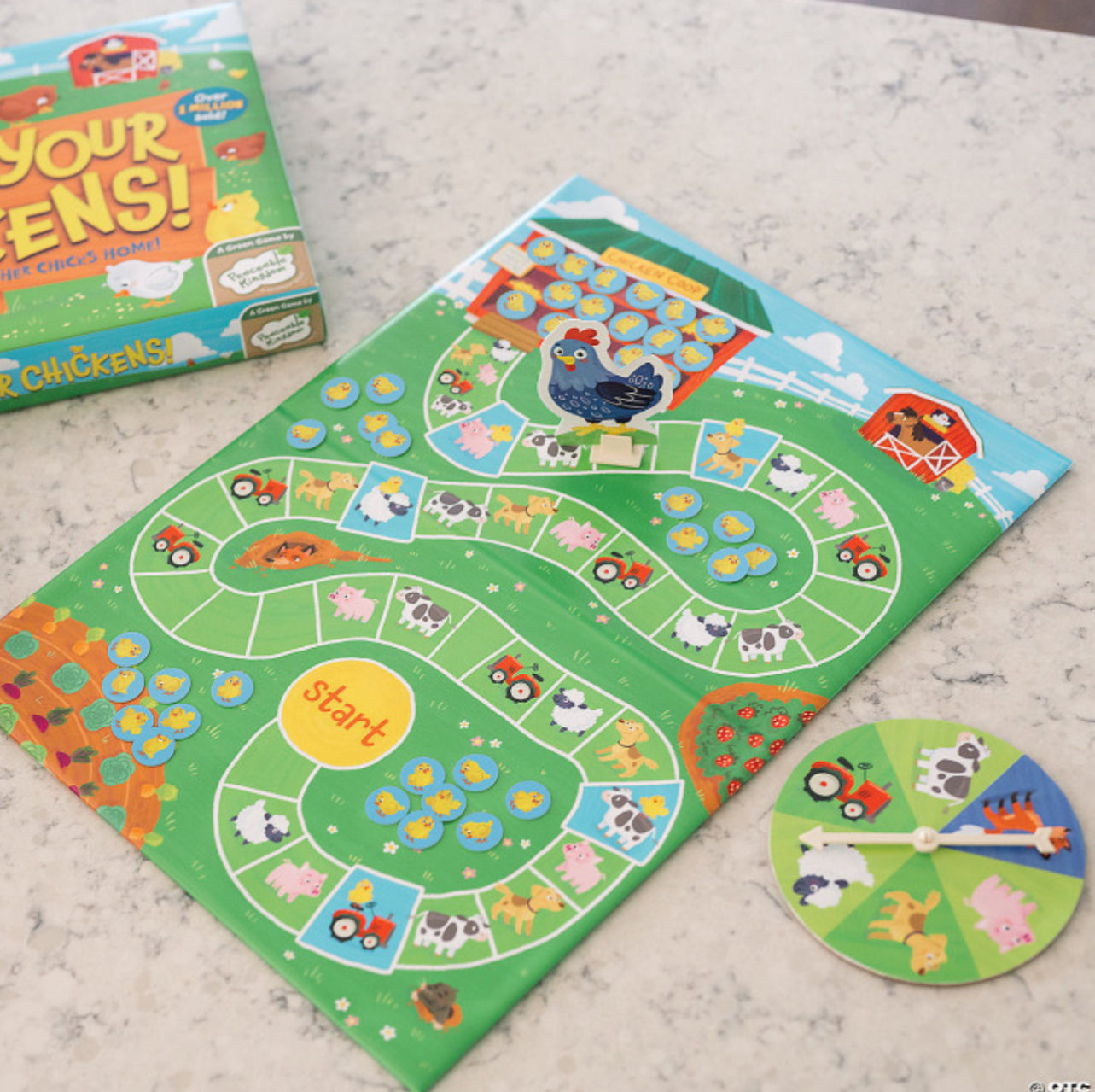 The baby chicks have flown the coop. Players help mother hen collect her chicks and bring them back to the coop. Spin and move, count the number of spaces, and collect that number of chicks. Take turns but work together. Collect all the chicks, and everyone wins! Count Your Chickens! eliminates stress, empowers a young learner, and teaches kids that playing together can be fun! Kids practice counting and cooperation.