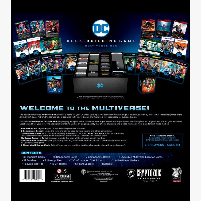 The new and improved Multiverse Box provides a home for your DC Deck-Building Game collection! With an original cover illustration by artist Omar Francia (Legends of the Dark Knight, Doom Patrol), this storage box is designed to fit sleeved cards and features a row specifically for oversized cards.