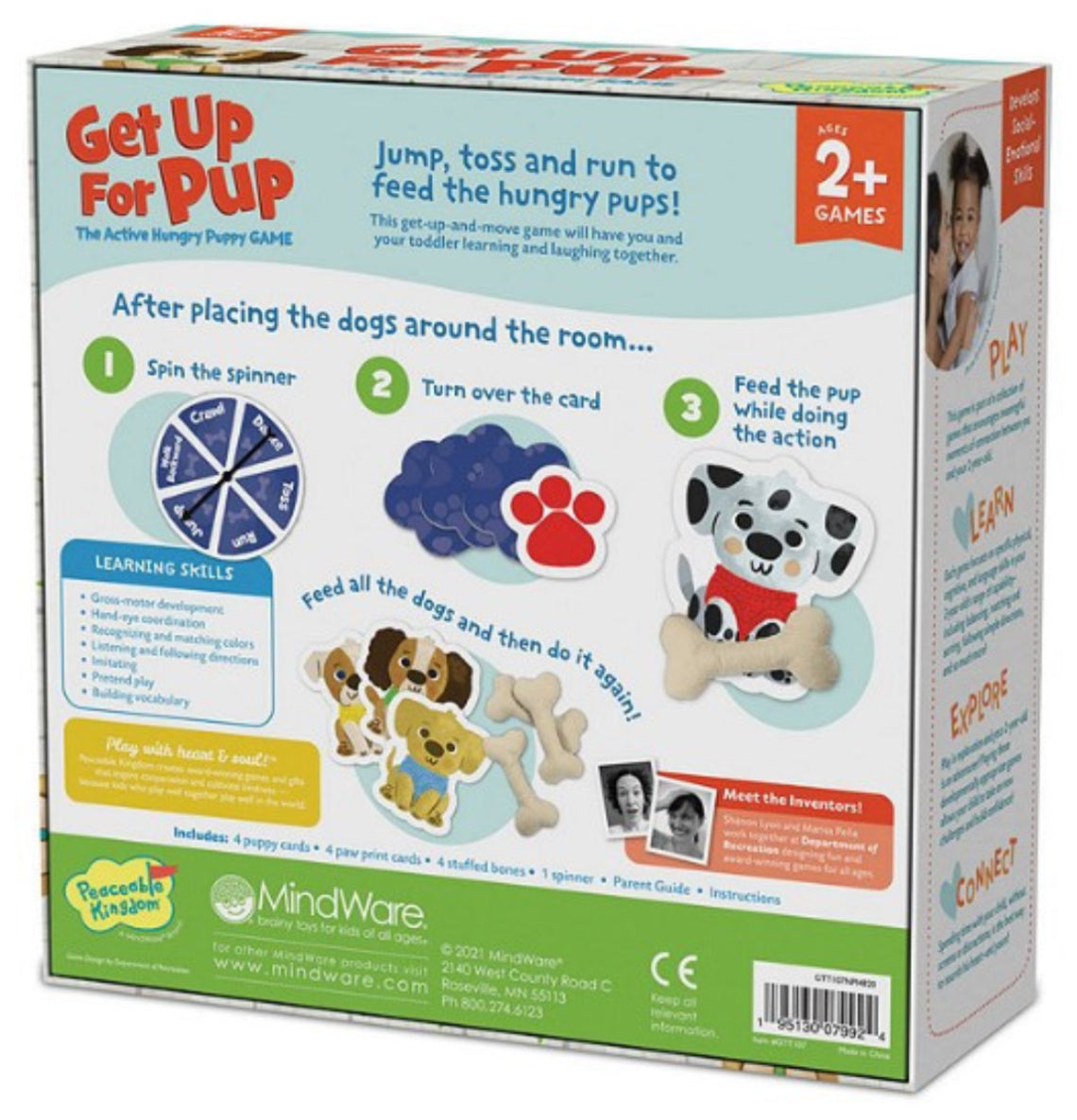 Win this early learning game by feeding stuffed bones to all the pups! A great first game option, little ones will learn to listen, follow directions and take turns as they draw cards and spin the spinner. They’ll also get up and moving through such fun gross-motor development activities as jumping, dancing, crawling and running. What a great way to get the whole family moving and playing together!