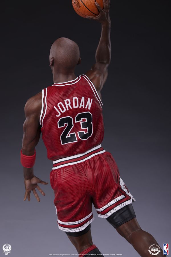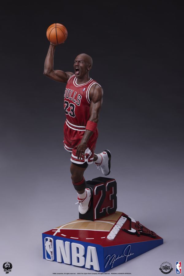 Measuring 26" high and 8.5" wide, the fully sculpted Michael Jordan 1:4 Statue perfectly recreates the iconic star soaring towards the hoop with his unparalleled athletic ability.