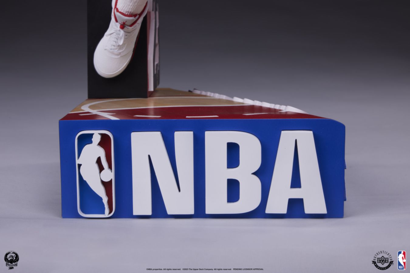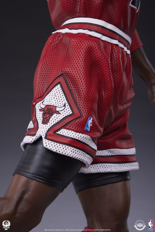This statue reaches new heights with its unmatched detail and a distinctive graphic base, emulating the Chicago Bulls court that Jordan called home for 13 seasons. The base, highlighting both the NBA logo and Jordan's famous number 23, is complete with a recreation of MJ's signature and the Bull's mascot Benny the Bull in a vibrant red and blue color scheme.