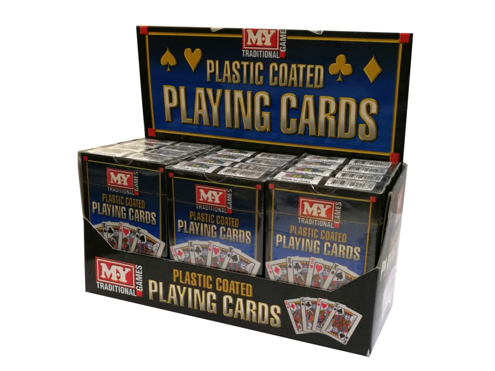 A countertop display box with 12 decks of plastic coated playing cards. Decks include 2 jokers.