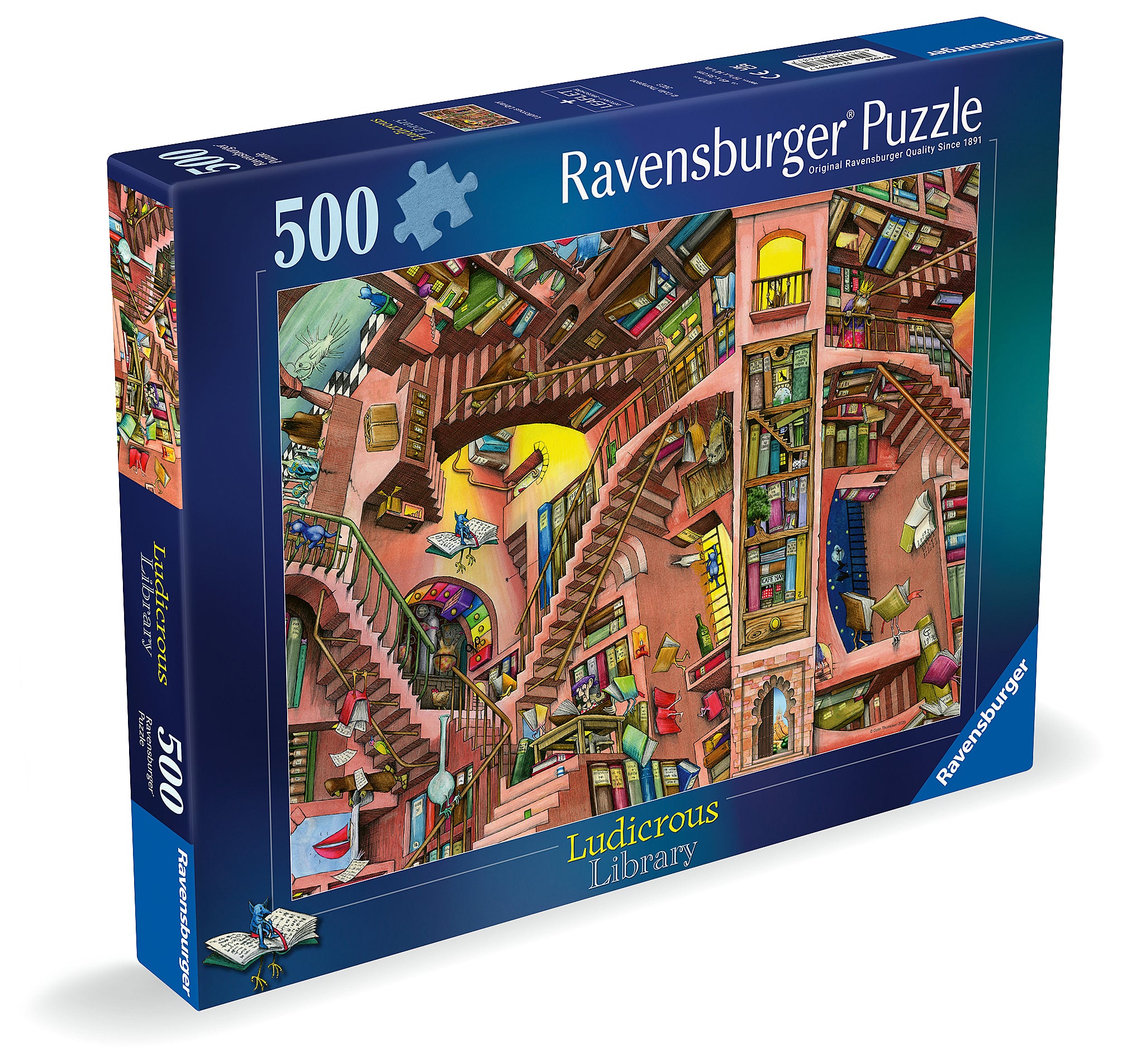 Step into a whimsical and intricately detailed world with Ravensburger’s Ludicrous Library puzzle. This 500-piece puzzle depicts a surreal library scene filled with floating books, twisted staircases, and whimsical details such as book-carrying birds and distorted architecture, crafted to spark imagination and visual delight.