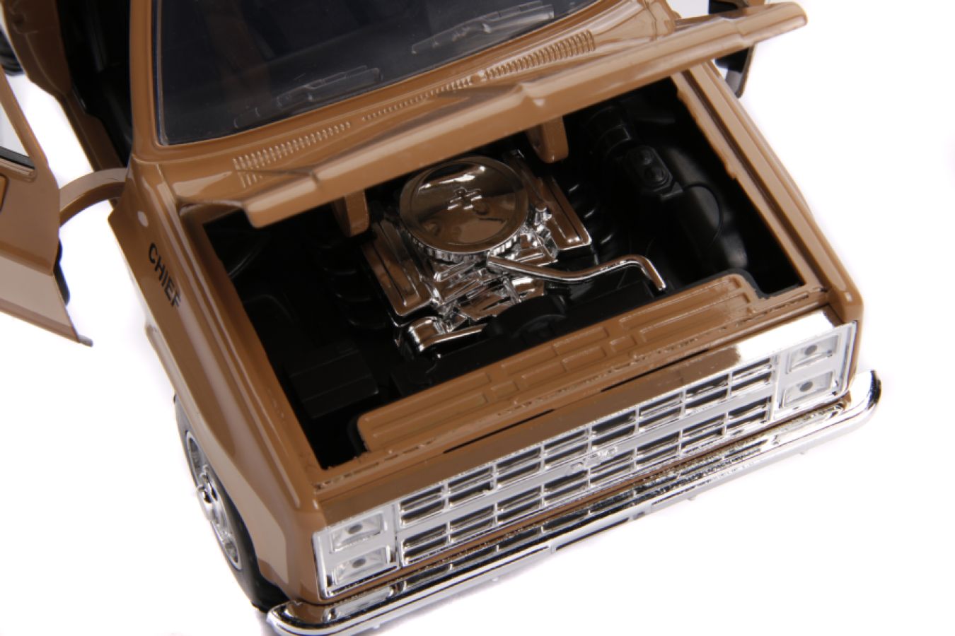 Make your escape from the Upside Down with the Stranger Things 1980 Chevy K5 Blazer. Featuring styling cues directly from Stranger Things, this collectible die-cast replica is sure to be a standout in any Stranger Things collection! Also includes a die-cast collectible Hawkins Police badge. Collect them all!