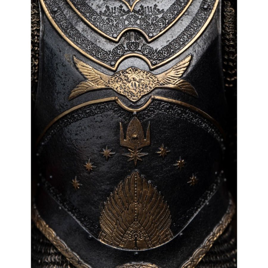 Special attention was given to the armour design for this piece, as subtle design elements and heraldry hide within them a rich language and deep history. Notably, the addition of the crown emblem upon his breastplate stands out, a feature markedly absent in Gondorian armour since the loss of their monarch, now returned anew.